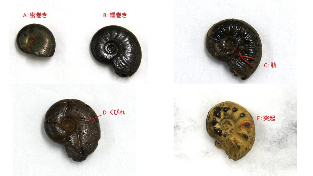例えば、AとBでは、外側の殻がすぐ内側の殻を覆う程度が異なります。相対的にその程度が強いものを密巻き(A)、弱いものを緩巻き(B)といいます。また、肋(C)やくびれ(D)、突起(E)などの装飾を殻の表面にもつものから、装飾を全くもたないものまで存在します。