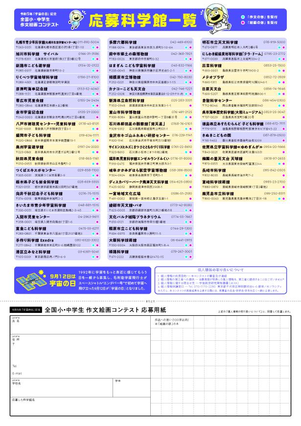 | 郵送先: | 〒950-0948 新潟市中央区女池南3-1-1 新潟県立自然科学館 「宇宙の日」係 宛 |