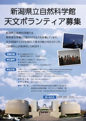 | 送付先 | 〒950-0948 新潟県新潟市中央区女池南3丁目1番1号 新潟県立自然科学館 ボランティア事務局 宛 E-mail: volunteer@sciencemuseum.jp |